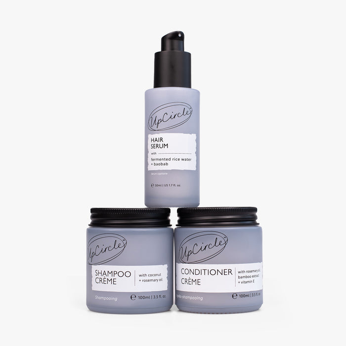 Our Best-Seller Shampoo and Conditioner Crème Set + Hair Serum! This pair of products will leave your hair irresistibly soft, strong and shiny.